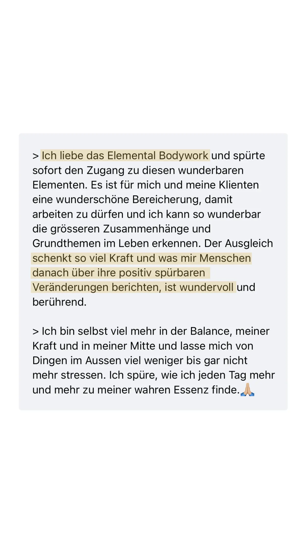 Du bist in der Lage Elemental Bodywork mit bisher erlernten Techniken zu kombinieren, um deinen Klienten in der Gesundheitsprävention zu unterstützen, und auch körperliche Begleiterscheinungen während dem Coaching schneller abfließen zu lassen.